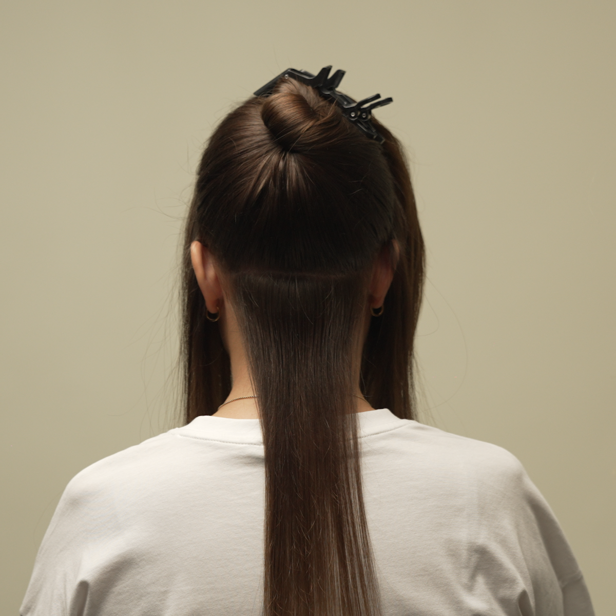 Steek je eigen haar op met een haarclip zodat je gemakkelijk bij de microringen kunt.