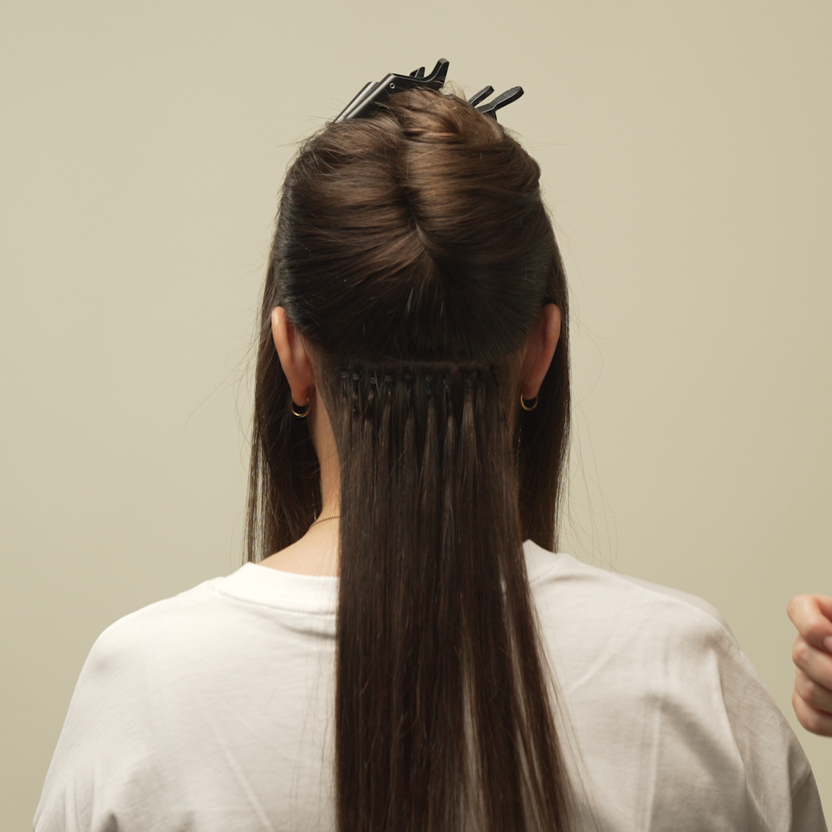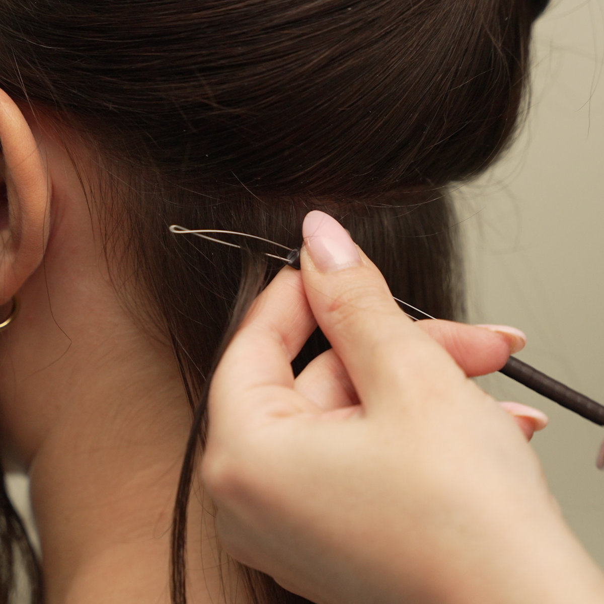 Houd de microring dicht bij je hoofdhuid (ongeveer een halve centimeter er vanaf) en plaats een van je microring extensionsplukjes in de ring.