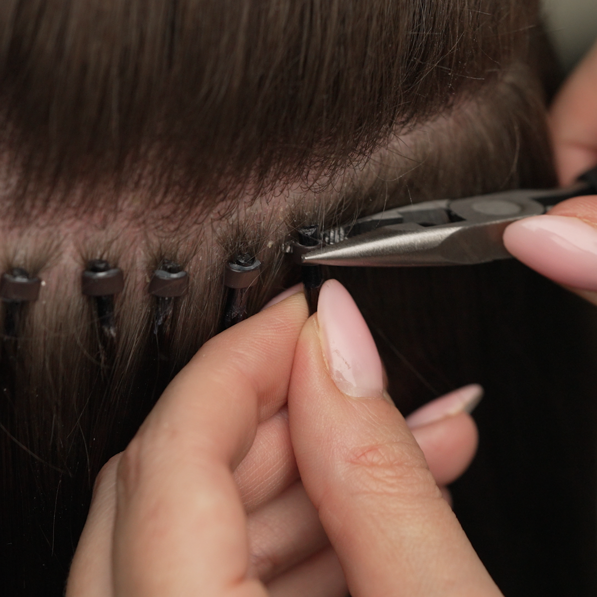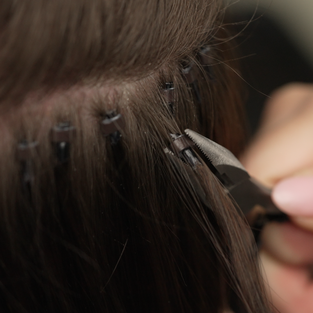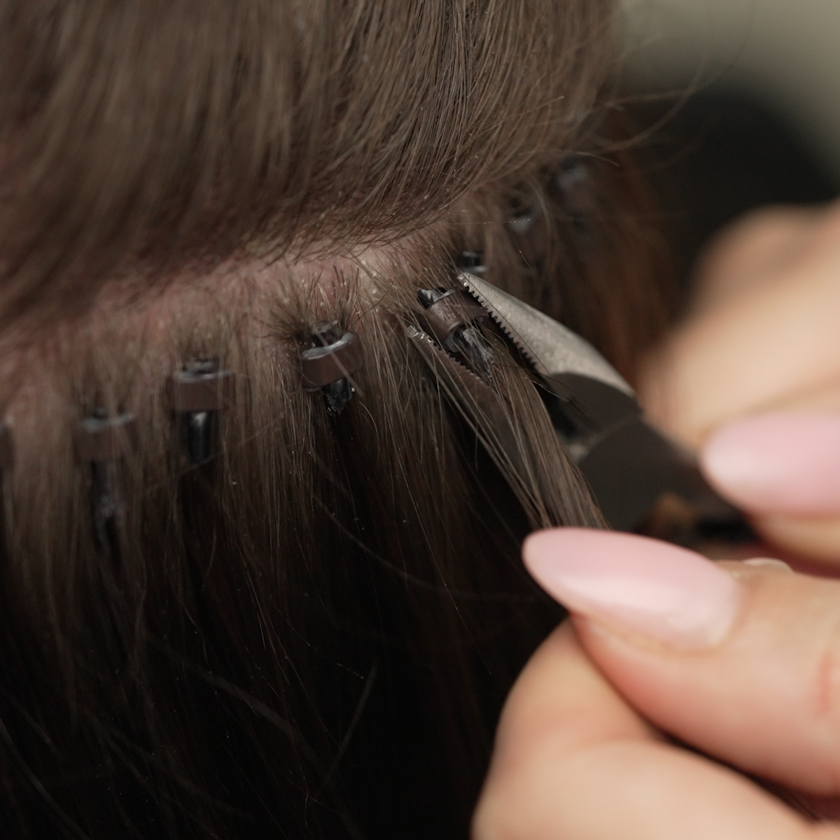 Als je ze weer wilt bevestigen, gebruik dan gewoon nieuwe microringen en een extensions tang.