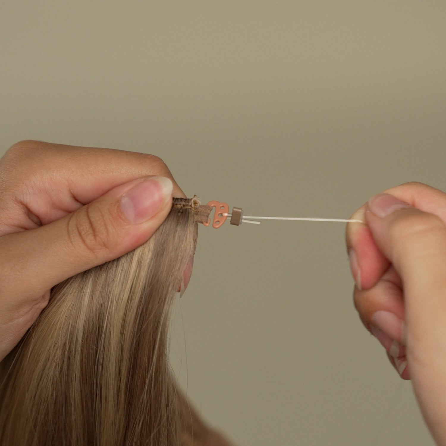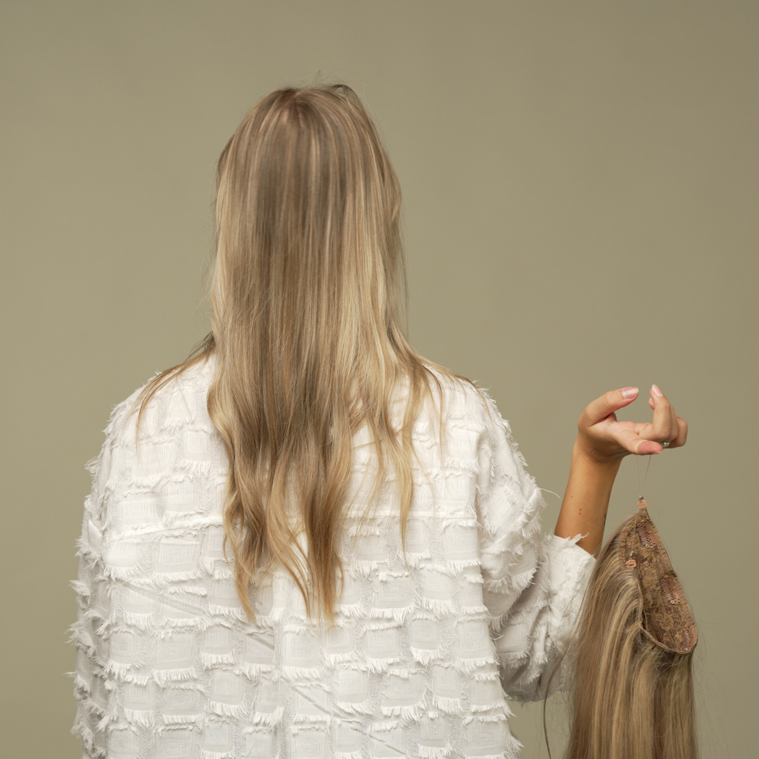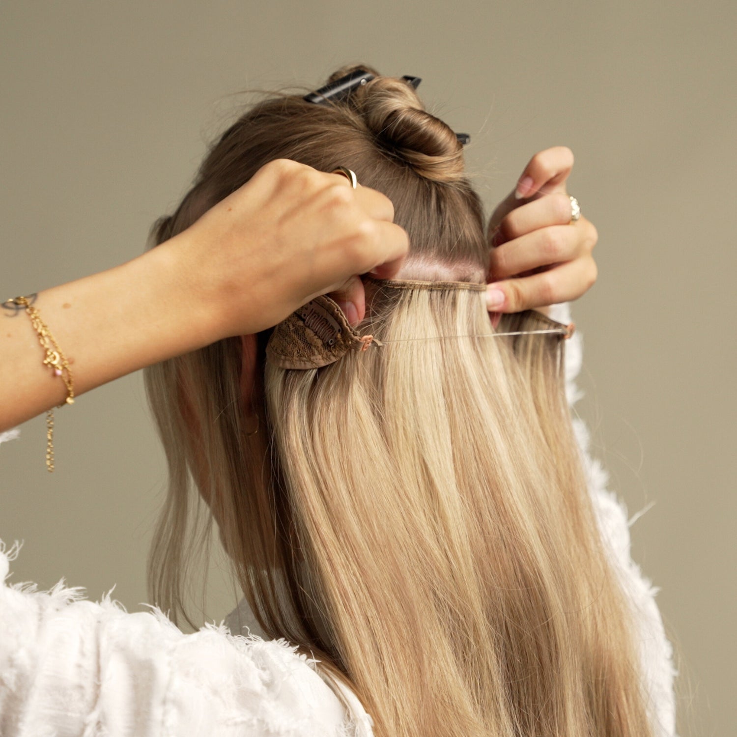 Je beslist zelf of je de draad wilt gebruiken – onze Halo extensions kunnen ook met clips worden bevestigd. Probeer het zelf even uit. De elastiek haalt wat gewicht van je Halo extensions, waardoor sommigen een draad prettiger vinden, terwijl anderen het liever vermijden.