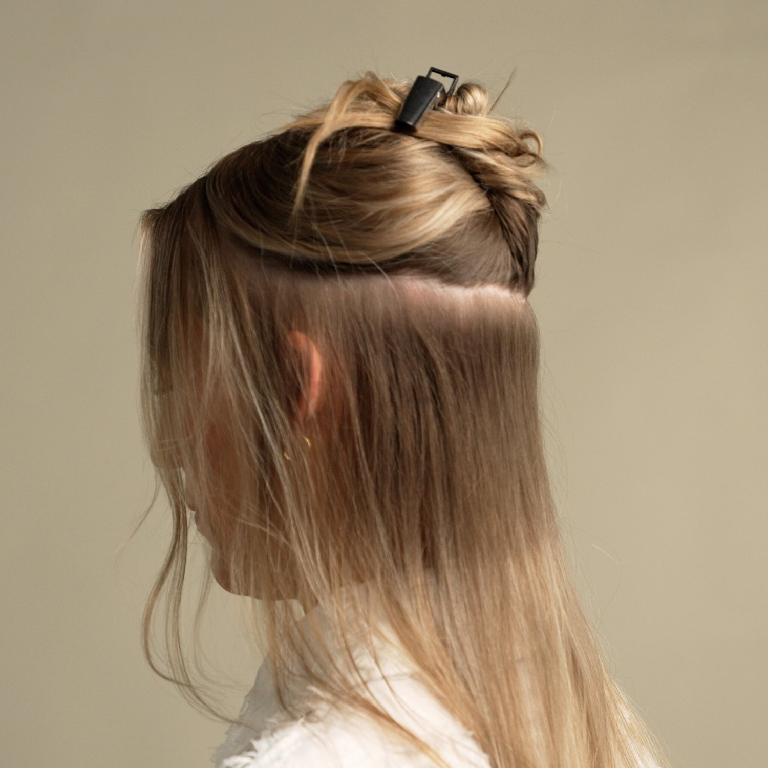Plaats je Halo extensions langs de scheiding en zet de 3 middelste clips vast in je eigen haar. De overige 2 clips aan de zijkanten hoef je pas later te bevestigen.