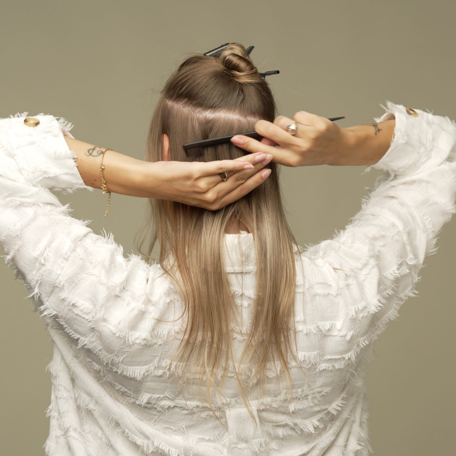 Voordat je je Halo extensions vastmaakt, is het slim om je haar lichtjes bij de wortels te touperen. Dit is vooral handig bij stijl of fijn haar - dan hebben je clips iets om zich aan vast te hechten.